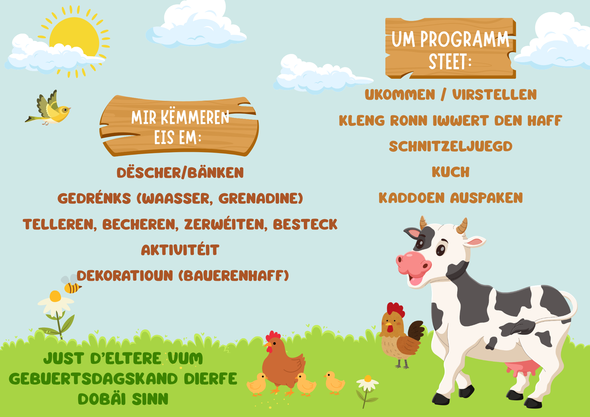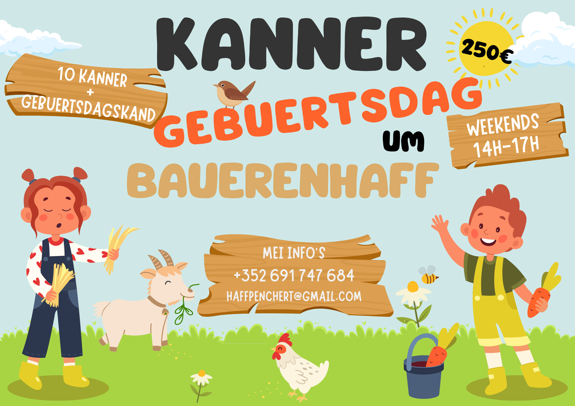 Gebuertsdag mol anescht - Dier wëllt ärem Kand e flotte Gebuertsdag organiséieren, da bidde mir iech un, d'Party bei eis um Bauerenhaff ze maachen. Jee no Alter, Joreszäit an Unzuel vu Kanner plange mir d'Aktivitéite fir d'Party vun ärem Kand. Fir weider Informatioune kennt dir iech gäre bei eis mellen.